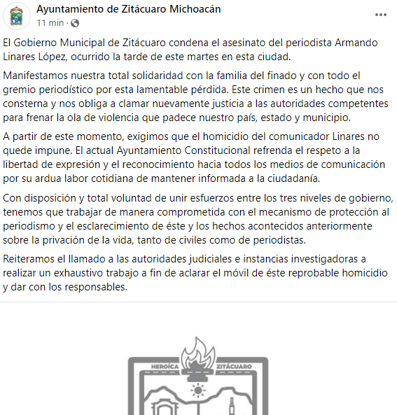Este asesinato es el segundo en contra de comunicadores del portal Monitor Michoacán. Al respecto el ayuntamiento de Zitácuaro ha emitido el siguiente comunicado
